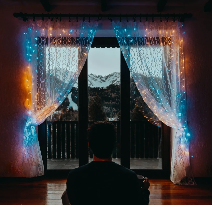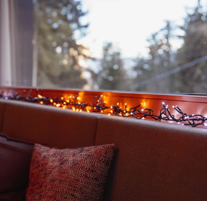 Следует использовать только LED-ленты и гирлянды: светодиодные элементы потребляют значительно меньше энергии и выделяют меньше тепла по сравнению с лампами накаливания, что делает их более безопасными для длительной работы и закрытых пространств.