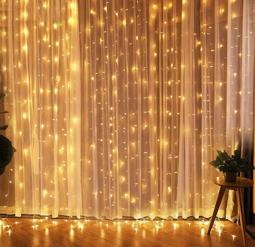 Крепление гирлянды на шторной ткани создает эффект рассеянного, романтичного света.