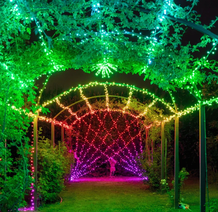Эффекты Twinkly на деревьях выглядят особенно впечатляюще благодаря глубине и объему — свет проходит сквозь крону, создавая настоящую живую анимацию.
